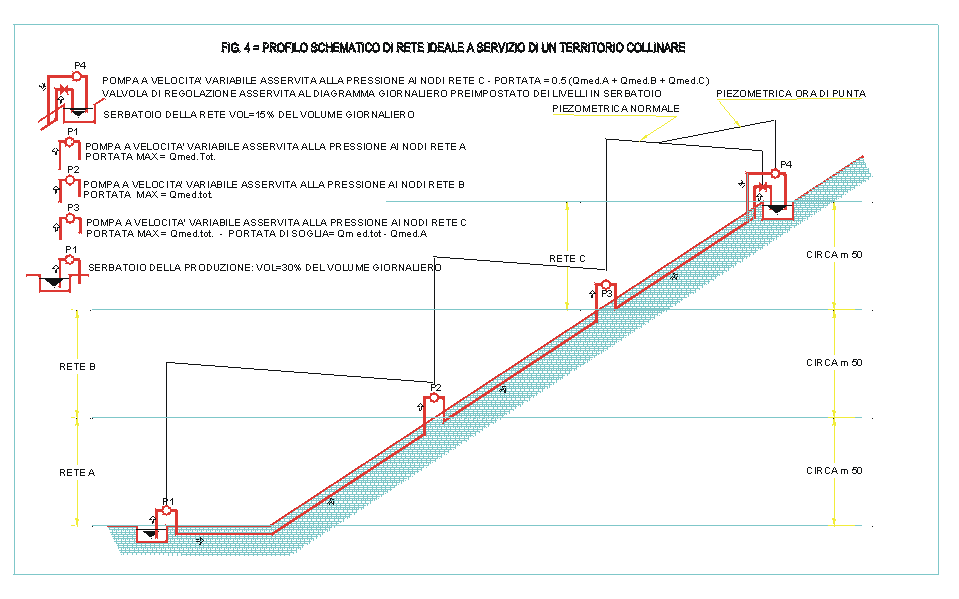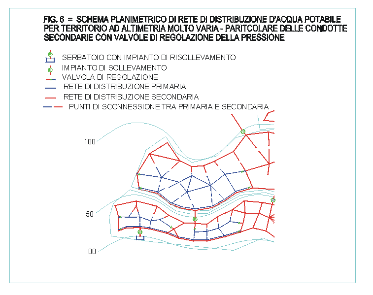 Ci si è dilungati anche ad indicare come, tramite aggiunta di alcune condotte secondarie di distribuzione munite di valvole di regolazione della pressione asservite alla pressione di arrivo, si possa migliorare notevolmente il servizio garantendo in rete, anche in presenza di territori accidentati come sono quelli in argomento, una piezometrica sempre parallela al suolo e diminuendo ulteriormente le perdite occulte.