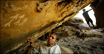 E proseguendo l’esplorazione, coperte da una densa polvere, incontrano altri esemplari d’arte rupestre: altre tre figure tracciate in ocra. Secombe, 20 anni, si meraviglia della raffinatezza di queste linee. E’ una rarità vedere tali motivi su questo lato della catena.