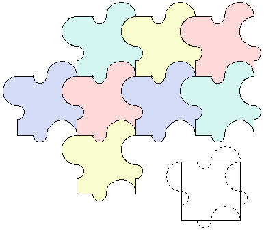 Costruire la mattonella di un pavimento una pavimentazione può essere un'attività didattica particolarmente interessante: si deve far fronte ad alcune regole e al contempo si dà spazio alla creatività. Basta osservare l'elemento non colorato della figura sottostante. Da un quadrato si tagliano parti che sono spostate fuori, sul lato opposto. In questo modo si ottiene la mattonella di un pavimento.