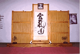 El Tokonoma de Nakano es muy simple, sigue el estilo japonés y es algo muy especial para mí. Además de ser el lugar más importante del tatami, existe un banderín con la palabra Aikido escrita por Sensei Yamamoto. Es su caligrafía lo que hace precioso a este banderín. Él mismo me lo envió como un regalo, que llegó desde Tokyo justo a tiempo para la Ceremonia de Inauguración
