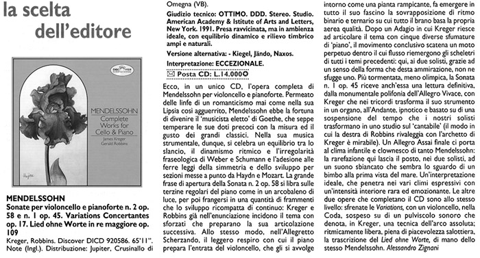 CD Classica (Italy, October 1999) - view in original language Here we have, in one CD, the complete works for piano and cello by Mendelssohn. Permeated by the passions of Romanticism as his peaceful Leipzig never was, Mendelssohn had the good fortune of becoming the "chosen musician" of Goethe, knowing how to temper his precocious gifts with the proportion and taste of the great classicists. In his instrumental music, therefore, one delights in an equilibrium between the elan, the rhythmic dynamism and the irregular phrasing of Weber and Schumann, on the one hand, and the adherence to the ironbound rules of symmetry and development laid down by Haydn and Mozart. The grand phrases of the opening of Sonata No 2, Op. 58, float freely on the strict triplets of the piano like a rainbow of light, which is then overcome by a number of fragments developed in condensed form by the continuo. Kreger and Robbins already at the beginning ignite the theme with sforzati which prepare the coming articulation. In the same fashion, in the Allegretto scherzando, the gentle breath with which the piano prepares for the entry of the cello, which wraps around one like a climbing plant, allows to emerge in all its magic the juxtaposition of binary and ternary rhythm on which fragment its own airy quality is based. After an Adagio in which Kreger succeeds in articulating the theme with five different shades of piano, the last movement unleashes a moto perpetuo in whose torrents the outlines of all the previous themes re-emerge. In this the two soloists, thanks to an admirable sense of form, do not lose a single one of them. More tormented, less Olympian, the Sonata No 1, Op.45, also receives a definitive reading, from the monumental polyphony of the Allegro vivace, in which Kreger in the chords transforms his instrument into an organ, to the Andante, hypnotic and based on a suspension of tempo which our soloists transform into a study in "cantabile" (The way in which Robbins' right hand rivals the bow of Kreger is admirable.). A final Allegro assai transports us to the childlike playfulness of so much of Mendelssohn: the soloists' rarefaction here gives way to a paler sound which seems like a child's first glimpse of the sea---an ideal interpretation which penetrates into the various expressive shades with an interior intensity which is rare and moving. The other two works which complete the CD are on the same level: the Variations, unleashed in the coda by a cello suspended on a tiny sound particle, which denotes in Kreger absolute control of the bow. Rhythmically free, full of the delights of chamber music, is the transcription of Lied ohne Worte, done by the composer.