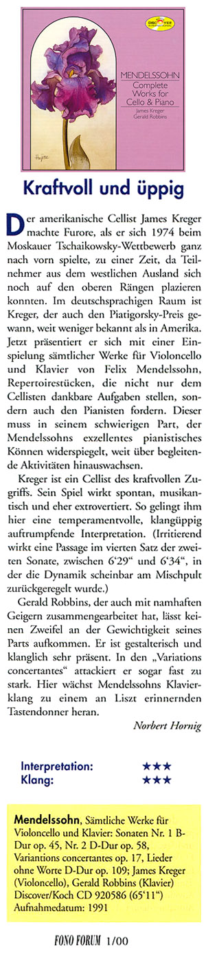 Fono Forum (Germany, January 2000) - view in original language Powerful and Opulent The American Cellist James Kreger created a furore when he placed near the top in the 1974 Tchaikovsky Competition in Moscow in 1974, in a time when it was still possible for participants from the West to place in the higher ranks. In the German-speaking world Kreger, who also won the Piatigorsky Prize, is much less well-known than in America. Now he appears with an interpretation of the complete cello works of Felix Mendelssohn, repertory pieces which challenge not only the cellist, who has many wonderful passages to play, but also the pianist. The pianist, in difficult music which reflects Mendelssohn's own excellent pianistic talent, must go far beyond mere accompaniment. Kreger is a cellist of great power. His playing is spontaneous, musical and rather extraverted. He succeeds here in an interpretation of great temperament, opulence of tone, and individuality. (One passage is disturbing in the fourth movement of the Second Sonata, between 6'29" and 6'34", where the dynamics were apparently scaled back on the mixing board.) Gerald Robbins, who has also collaborated with many renowned violinists, leaves no doubt as to the importance of his part. His presence is felt in the sound and shaping of the music. In the Variations concertantes his attack is almost too strong. Here Mendelssohn's piano sound begins to remind us of the thundering piano keys of Liszt."