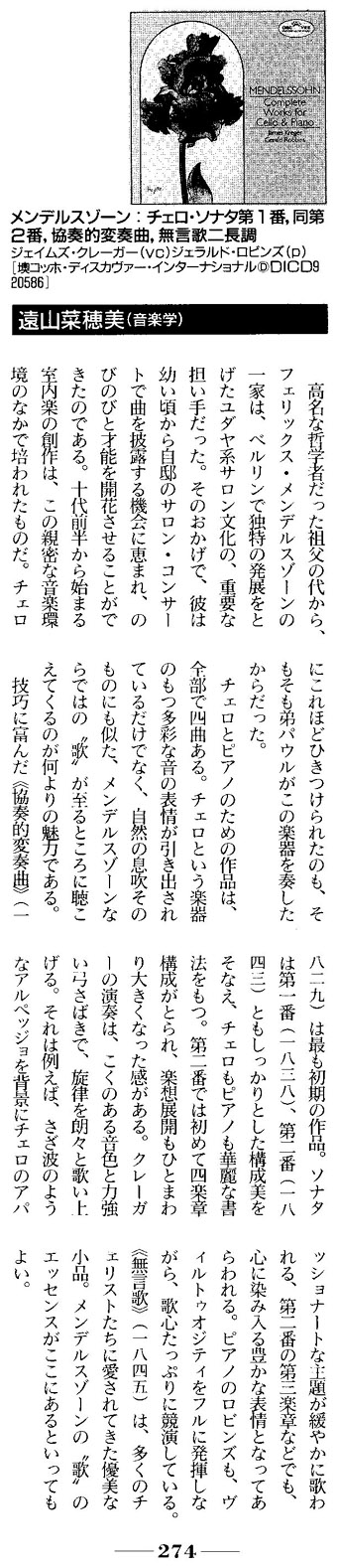 Record Geijutsu[excerpt] (Japan, October 1999) - view entire review in original language James Kreger's wonderful performance shows a very deep tone and strong bow arm under complete control. He sings the melodies of Mendelssohn with a beautiful voice. Especially in the third movement of Sonata No. 2 his sound is so deeply expressive that it touches your soul. Indeed he plays the theme of this movement absolutely beautifully. Mr. Robbins' piano playing is also melodic and expressive and shows complete compatibility and communication with Mr. Kreger. In the Song without Words their performance is persuasive enough for us to understand the true meaning and importance of the "song" to Mendelssohn.