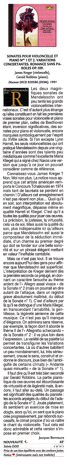 Classical Music Magazine (Taiwan, R.O.C., Vol.90, February 2000) - view in original language Annual Recommendations of Eight Major Music Critics During the last two years of Mendelssohn's life he was deeply touched by the performances of the young cellist Alfredo Piatti. He also wrote a concerto for him, which unfortunately has been lost. Even if only just a part of this concerto still exists, its beauty and romance would make it one of the strongest candidates in what has been a traditionally sparse list of great cello concerti. However, at least Mendelssohn left us four marvellous cello pieces. In my collection I have only two CD's of the complete cello works. Besides this Koch Discover CD (Kreger/Robbins), I have the BMG CD (S. Isserlis/M. Tan). Before anyone would listen to these two CD's, of course they would choose the Isserlis CD first, because it is from a large company (BMG), and the cellist Isserlis is someone who has been expected to be one of the stars of tomorrow. And the pianist Tan has achieved recognition from his recordings of the 5 Beethoven Piano Concerti with Norrington. If one uses this kind of comparison, then James Kreger is not as known or famous in the music world. If the Taiwan distributor had not imported the Koch Discover catalog, then music lovers would never have had the opportunity to recognize this super marvellous artist cellist. The American Kreger participated in the Tchaikovsky Competition in 1974. Athough he did not receive the first prize, he was the top American prizewinner. On this CD, not only is his music full of richness, abandon, and elegant beauty from the lowest to the highest registers of the cello, but it always maintains the true and inevitable sense of the sound. Something exceedingly rare to find, especially in our present day, is Kreger's rich musical persona and his sense of reverent dedication to the message of the music in addition to his portrayal of the changes between emotional light and shade. Van Cliburn competition winner, pianist Gerald Robbins, proves himself to be an excellent collaborator. This performance deeply catches the heart and spirit of the listener. All these points which have been mentioned are something which Isserlis can never hope to achieve! I am hereby seriously recommending this CD as the best cello recording of the year.