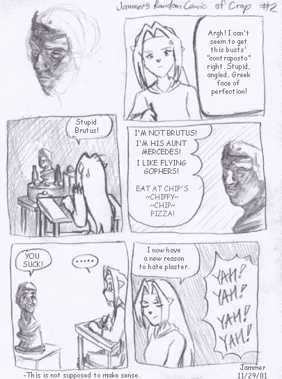 Just like the title says, "Jammer's Random Comic of Crap." Whee! Pencil on computer paper. Drawn out of frustration at a still life. Drawing out extreme feelings is good for crap comics!