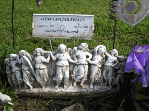 | In the early months after Jason died, I would be out on my boat and a certain song would come on...I had a vision every single time of all our angels arm in arm kicking their legs up and singing. Well, one day on the way home from the cemetary, I was just about to pull into my driveway. A voice came to me "Go to Marshalls" I didn't want to but did. I went in and back to the glassware section I saw this statuary sitting right there out in the open, it was the exact vision I had often seen. I put it at Jay's site in the cemetary !!!!! |