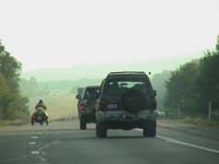 There is actually no ravine along the highway here. Several miles down, though, the road is suspended high in the air through the mountains. There are some hills and turns that appear like the road will stop and you will end up in a ravine.