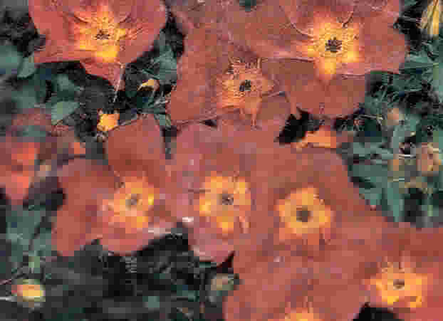 A once-blooming species rose that creates a startlingly brilliant spring display. Bright single roses bearing no scent cover a hefty shrub. This rose does best in more arid states, but it is nonetheless very hardy. Black spot troubles this rose occasionally. |