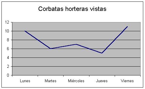 | Se deduce del gráfico 2, que la variación en el número de corbatas horteras vistas en un mismo día es un tanto aleatoria. Los datos no se pueden interpretar adecuadamente y dan a entender, en cierto modo, que las personas escogen la corbata diaria con la luz apagada y sin mayor razonamiento. Quizá entre en juego la opinión de la mujer, pero eso requeriría preguntar a los interesados; sobretodo a los personajes con corbata amarilla. |