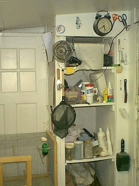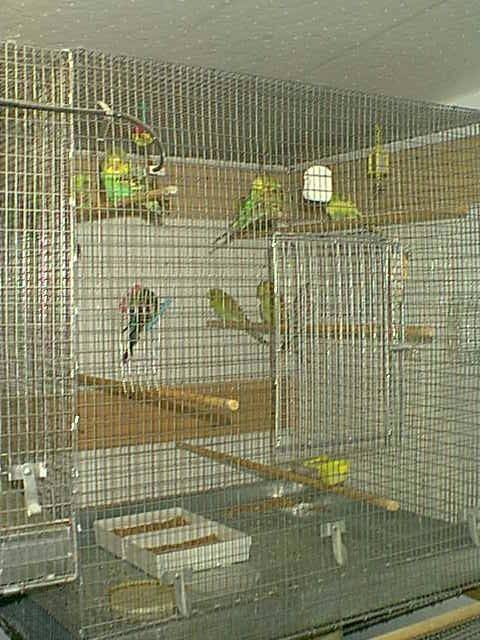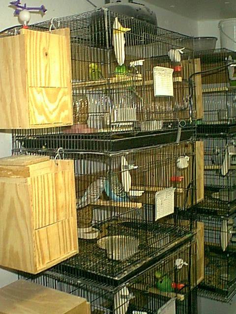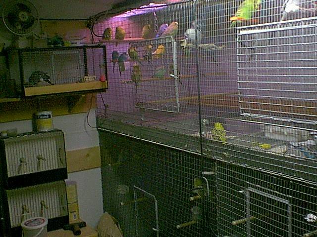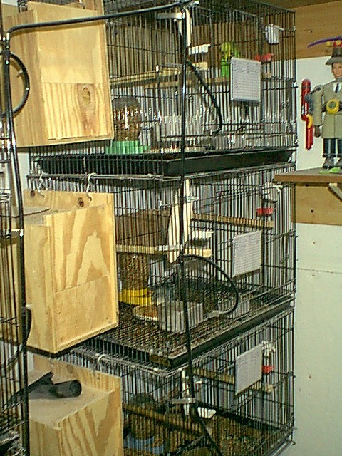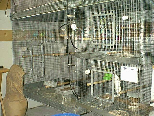 My aviary is attached to the side of our house. I can walk from the house thru a door into the aviary which makes it very handy. It is 8'x12' with 9 breeding cages, 2 - 24"x16" juvenile cages. A 3'x3'x3' holding cage and a 4'x3'x3' flight and a 9'x3'x3' flight. As you can guess space is at a premium, never enough.