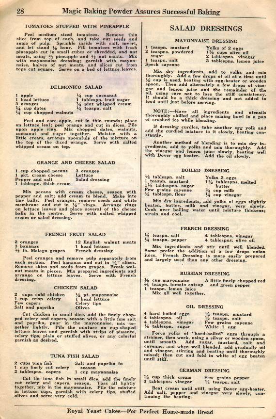 Tomatoes Stuffed with Pineapple, Delmonico Salad, Orange and Cheese Salad, French Fruit Salad, Chicken Salad, Tuna Fish Salad, Mayonnaise Dressing, Boiled Dressing, French Dressing, Russioan Dressing, Oil Dressing, German Dressing