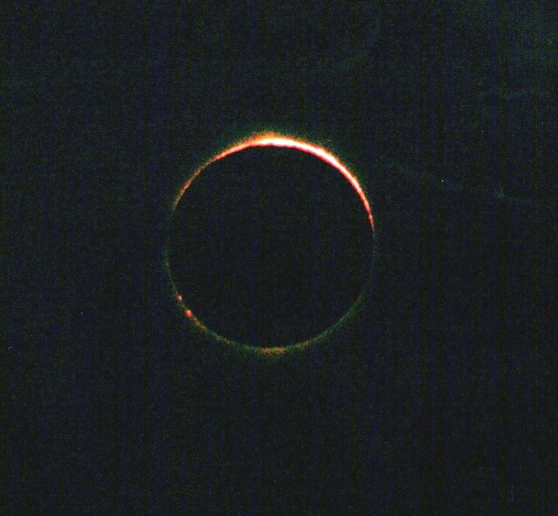 long. Polar brushes were evident. Prominences at 1 o'clock and 7