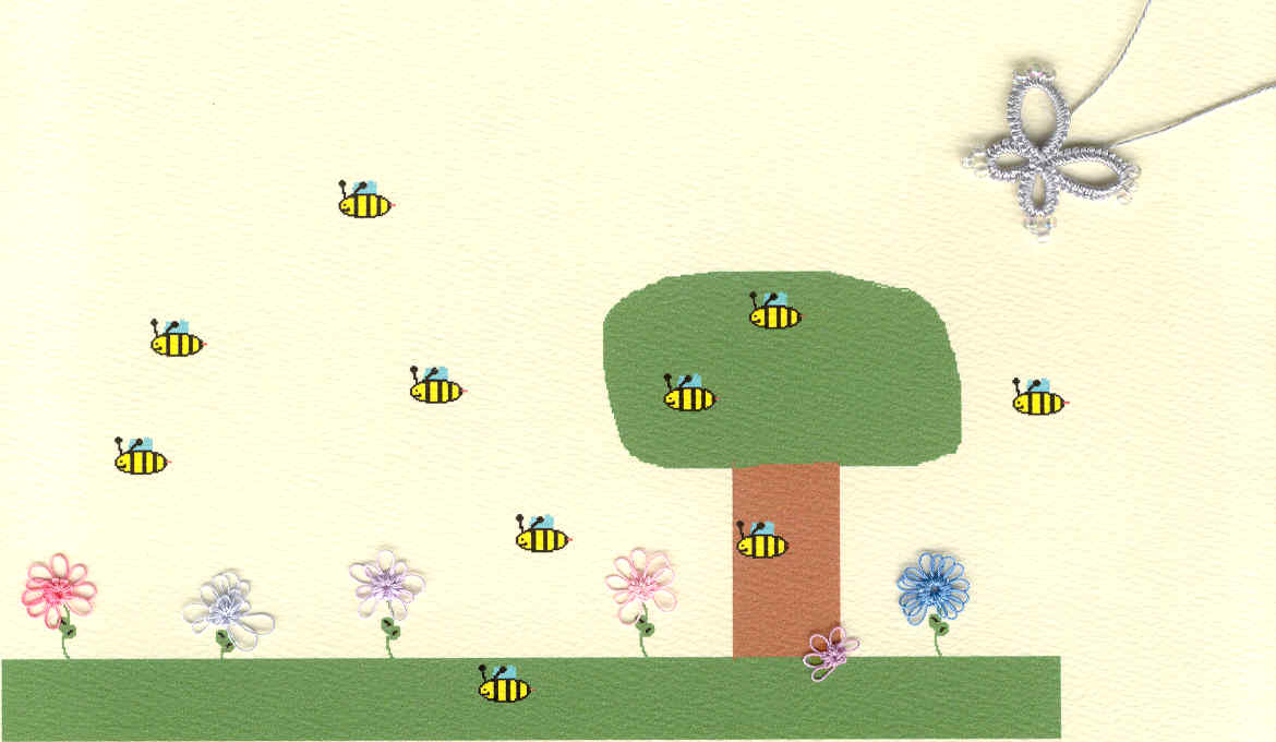 | This cute card was designed and the butterfly was tatted by 11 year old Chelsea. My contribution? Some of the little flowers at the bottom. :-) |
