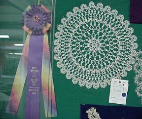 | Here is my 2000 Colorado State Fair doily. The pattern is from Traditional Tatting Patterns Edited by Rita Weise. I was totally blown away when I found out it took the blue ribbon in it's class and also received Best of Show in the lace catagory from the Rocky Mountain Lace Guild. Friend and fellow tatter Debbie Arnold took the picture for me. :-) Thanks Deb! |