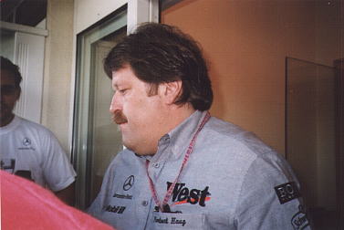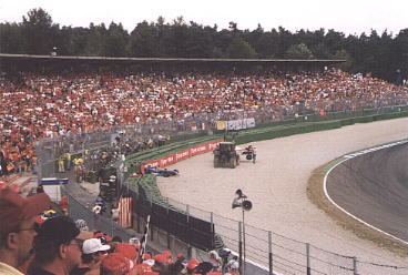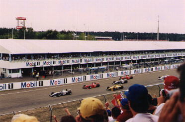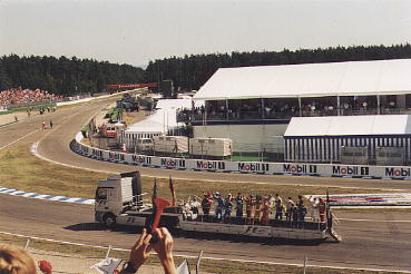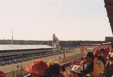 `99 war ich mit Tina und Debbie beim G.P. in Hockenheim. Wir hatten uns vorgenommen, jeden Tag früh aufzustehn (ca. halb 6) und zu einem der Hotels zu fahren, in dem die Fahrer und Teams wohnen. Leider hat nichts geklappt...Erstmal hatte Tina Windpocken und konnte nur Samstag und Sonntag mit kommen...dann haben Debbie und ich bis spät in die Nacht hinein gequatscht und waren morgens entsprechend müde... Also sind wir auch Donnerstag nicht zum Flughafen gefahren, was wir eigentlich vor hatten... ...und Freitags zu keinem Hotel. Wir waren ja schon froh, daß wir zum Anfang des Trainings am Freitag pünktlich da waren *g* Na ja, Samstag waren wir dann beim Hotel, aber natürlich zu spät. Alle Fahrer waren schon weg und wir haben noch Norbert Haug, Keke Rosberg, Adrian Newy und Alain Prost gesehen. Ist ja auch schon was. Beim Rennen ist Jacques dann noch direkt nach dem Start ausgefallen. Das war zwar nicht so schön, aber "freundlicherweise" hat er das ja genau in unserer Kurve gemacht, so daß wir alles gut sehen konnten. Alles in allem war es aber trotzdem ein schönes und lustiges Wochenende. | |