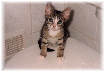 Den Racker hab´ ich im Alter von 10 Monaten bekommen. Zuerst war er sehr ängstlich, aber Jörg und ich haben ihn zu einem Schmusekater erzogen. Auf der einen Seite kann er sehr ätzend sein, wenn er von hinten auf Pixi losgeht und sie so beißt und kratzt, daß sie schreit und wegrennt. Leider können wir nichts dagegen tun und zum Glück passiert sowas nicht sehr oft. Andererseits ist er total lieb und manchmal eine richtige Klette. Kaum liegen wir auf der Couch, klettert er bei einem von uns auf den Bauch, kreischt "Mi-Mau" und macht es sich bequem. | |