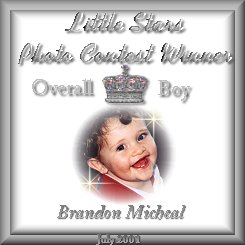 | Name: Brandon Michael Age:11 months Birthdate: 7-9-00 Eye color: blue Hair color: brown Favorite activity: playing with Ryan Special Talent: making Ryan laugh |