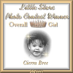 | Name: Cierra Bree Age:2yrs old Birthdate: 11-23-98 Eye color: brown Hair color: brown Favorite activity: playing with her bubbie Brandon Special Talent: melting her aunt's heart |