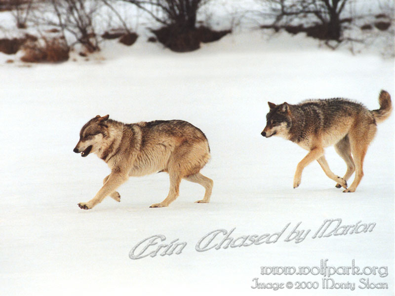 | The wolf on the right (Marion) is chasing the one on the left (Erin). You can see that Erin has her tail tucked between her legs and ears laid back (submissive position). Marion, however, has her ears pricked and tail held high (dominant position) |