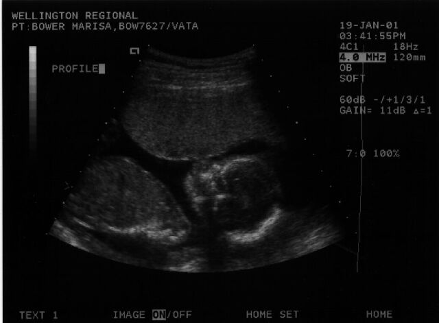 | This is another profile, but you can't see the facial features as well. Instead of zooming in on the face, you can see the baby's head and abdomen (including the outline of the spinal cord). |