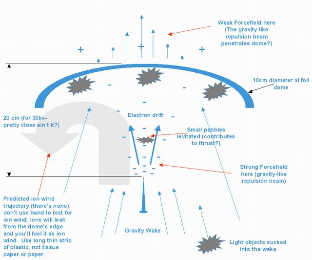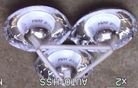 The picture below is just three of these saucers joined in the shape of a triangle. The white styrenes below the saucer is meant for adding rigidity and for protecting the auxiliary electrode during rough landing. The manner the saucers is positioned is meant for upward movement. Its not stuck at the ceiling, its just placed upside down, then flipped the image vertically so its positioned correctly for upward movement.