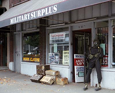 A gas-masked dummy stands guard outside this surplus store