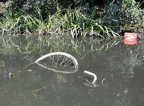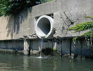 Approaching the big red bridge at Damen, Sue was waiting with her bike above. She pointed out an even greater pile-up of shopping carts on the landing above the water, twenty or thirty filthy carts probably plucked from the river on some cleanup day. After the bridge the rough banks are replaced by tall iron, concrete and wooden walls. I'm glad I don't need to stop along here, but if there was a boat problem I'd be in trouble, as the walls provide no way to climb up out of the water. Up above, the backs of random industrial and commercial buildings are visible. Most of the businessess don't take advantage of the riverfront location. Many of them have simply paved over their land nearly to waters edge, for use as parking lots or truck storage. Just past the Damen bridge I encounter a flowing pipe straight of an ecology comic book.