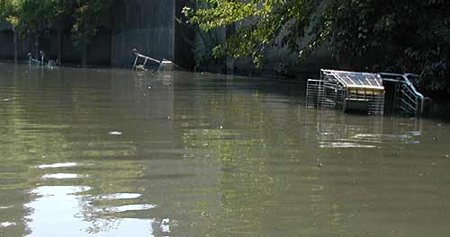 The quiet, shallow areas behind the supports of bridges are settling areas for items thrown down by passersby from the streets above. Near the bridge at Diversey, the river becomes a lost shopping cart graveyard, with no less than 13 carts scattered here and there along the banks. The ducks have adopted some as perches to keep a watchful eye on boaters passing by. Who knows how many more lurk just beneath the surface? Its enough to make a person in an inflatable boat a little nervous.