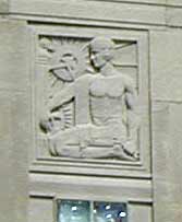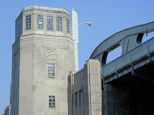Each bridge has its own story and style, from the shiny new Damen bridge to the rusty swinging railroad bridge just past Cortland. This Art Deco bridge tower with industrial bas reliefs is at Ashland.