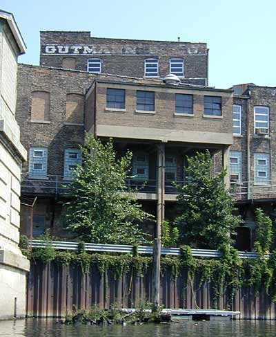The Ashland bridge is followed immediately by the Webster bridge. I hadn't realized how these two bridges meet at a right angle right at the riverbank. There is a lot to look at, but the paddler must beware, because a water treatment plant spews frothy aerated water from underwater pipes on both the left and right bank just above and below the Webster bridge. The danger for a small boat is that, in addition to the turbulence near the pipes, the aerated water may not provide enough buoyancy to stay afloat, causing the boat to tip or capsize. I picked my way past the foaming roiling water carefully. Across the river, a great pile of brick industrial buildings towers over the water. This is the Gutman Bros. Tannery, nearly the last of the once numerous tanneries along the river. The building is an lively extravaganza of haphazard brick additions and outbuildings, hissing pipes, mysterious steel vats leaking brown fluid and funny smells. A wonderful carnival of nineteenth century industrial activity for the paddling tourist to drift by in silence and wonder.