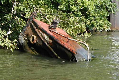 I was hoping to get a photo of one of the power boat yahoos racing directly up the river with a roaring wake behind, but so often they would come around the corner so abruptly that I never had a chance to get the camera ready. And after they had passed, I was too busy facing down the steep wakes, both from the boat directly as well as the waves reflecting from the metal walls of the channel. For many minutes after the boat had sped on, I'd still be struggling with the steep waves bouncing across the river and back again and again. Following the shore of Goose Island near the remnants of the old Ogden bridge I come across this miniature shipwreck. Kind of cute, like Scruffy the Tugboat. Where is the rest of Scruffy? How did this happen?