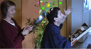en lisant le journal quand, soudain, sa femme lui assène un grand