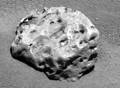 This is a "meteorite" made of nickel (something more?) found by Spirit at Gusev crater. The fact that it was so easily found, so "clean" and free of oxidization, and so gently placed on the ground, poses tremendous new questions. Another indication of the possible recent bombardment and destruction of the once hospitable Mars environment? |