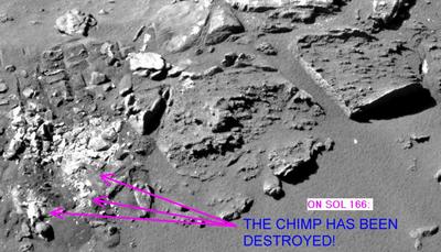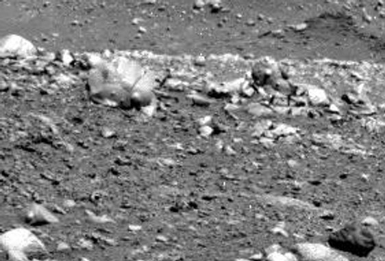 The astounding left image anomaly resembles a deformed monkey skull. Fossilized remains of some aborted genetic experiments? Just a few hours after I published this image on the web, the rover Spirit maneuvered in order to completely destroy the "skull" with its wheels! |