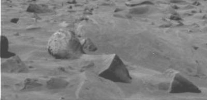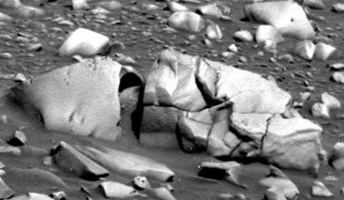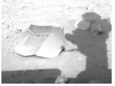 Very anomalous non-fractal rock found by the rover Spirit: Rectilinear and parallel edges, perfectly flat angled surfaces, and curved edges at the bottom, also indicating some hollow interior! |