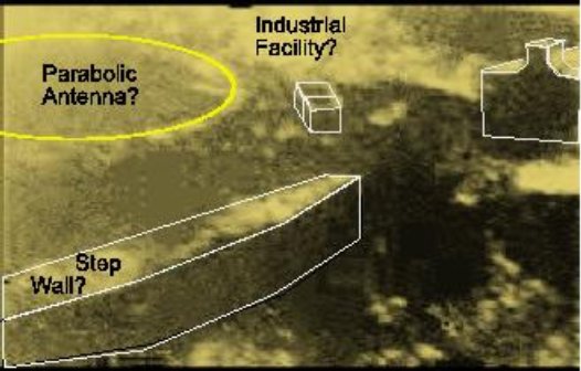 From Spirit-Sol-406. It seems there's a hollow (boxy) rock with something strange inside. A critter, a plant or what? The above image shows both the Tholus and the mesa with an exceptional anomaly "nut shaped" depression which center can be found at point "D" on the pythagorian schematic shown at right. (Thanks Mars Express camera and Gary) Below you can see the table I've created showing the approx. calculation of the angles and distances presented in the pythagorian diagram of the Cydonian ground anomalies. I had used the "X" dimension, the theorem of pythagoras and the law of the sines. |