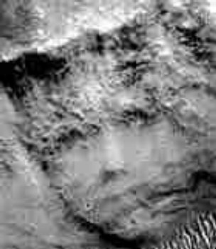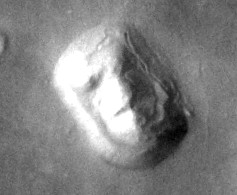 The famous "Crowned Face" found by Greg Orme on Mars: At least six elements of a human face are positioned exactly where it was supposed to be, not to mention that the formation presents a strangely beautiful and calm facial expression! Natural? |