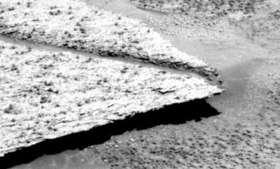 At the Opportunity landing site, it is possible to see several rectangular slabs on the floor. This one above seems to have a very thin thickness, similar to a sheet of rock, and the rectilinear extremity is suspended in the "air", projecting a shade on the floor! |