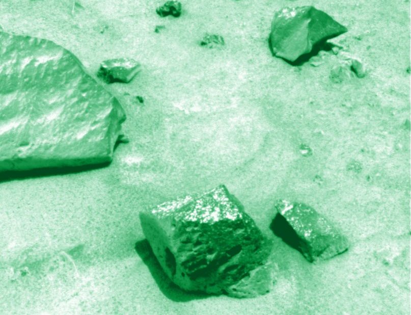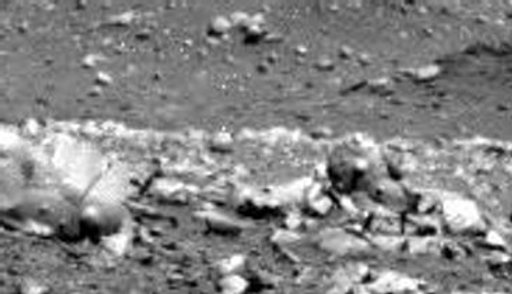 Above: From Spirit's raw data I've found this very strange rock, combining several elements not compatible with a natural formation. And at the extreme left, another rounded elevation, like a ball, with a rounded shadow projected towards right. The rock has some resemblance with the remains of a partially buried statue. |