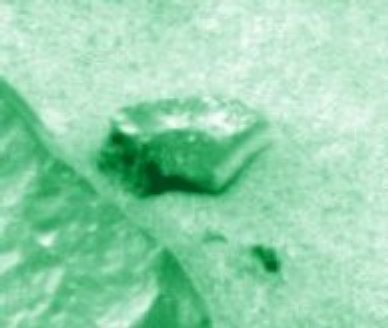 Just located in front of the Spirit's landing site, in the Gusev crater, the so called "Squared Hole Rock" or "Holey Rock", shows non-fractal geometric characteristics like a flat face, with elliptical perimeter, perpendicular to the ground, containing a very strange squared hole on it. It also appears to be covered by some sort of varnish. I did not find a justification as why NASA lost the chance of making a detailed analysis of this rock. |