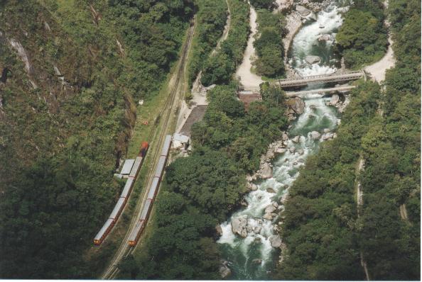 Aguas Calientes train station from Huayana Picchu. River Urubamba is one of the source waters of the mighty Amazon.