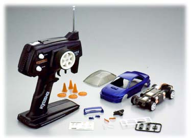 I got this from my (ex) girlfriend as an anniversary present. I love this toy! I painted the body the color of my girlfriend's choice, which was yellow. This thing is the most incredible mini RC car ever. The car takes four AAA's, and I use 500 mAh Nickel Metal Hydride batteries. The transmitter is actually a common entry level radio made by JR Propo called the Python. Compare it with Kyosho's transitter, the Perfex, you can see it is almost identical. The only differences are the brand name and the steering wheel.
