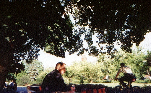 17.50 Rast på väg mot Gamla staden. Cola och chokladkaka för mig, Glass, yoghurt och melon för Christer. Mysig park och strålande sol. Innan denna rast inhandlade Christer en ilsket blå handduk. Något ska ju alltid glömmas hemma, detta år en handduk.