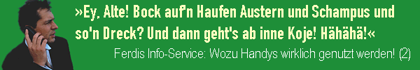 | Außerdem geplant: Deutsche Jugend: Selbst "Kulturelite" dumm wie Brot, aber immerhin witzig - Sarah Connors Special: "Udo Jürgens steht auf kleine Jungs, hehehe. Hihihi. Goiler Gag, ne?. Hab ich etwa jetzt was dummes gesagt? Wo ist denn mein Manager?" |