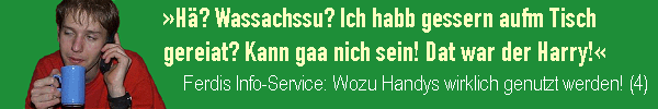 Wenn Mami Euch total überwachen will, schenkt sie Euch ein Tragetelefon (Häändy). Demnächst mit Ortung per GPS-Navigationssystem. Finger weg! Lehnt auch dieses Geschenk ab! Es ist ein trojanisches Pferd. Babyphone gehören ins Kinderzimmer. Schluss mit dem Überwachungsstaat!