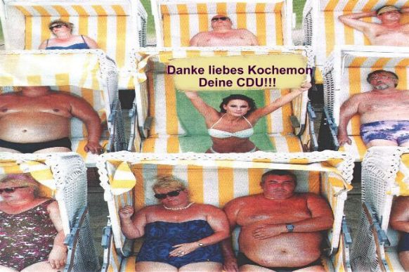 "Hallo, lieber Rolli! Weil die Kochtöpfe letztes Jahr so üppig ausgefallen sind, haben wir etwas länger Urlaub gemacht und möchten uns dafür bei Dir bedanken, gell, sei so doch noch so gut und mach, daß wir den nächsten CDU-Parteitag gleich hier am Timmendorfer Strand abhalten können, damit wir den Besitzstand nicht immer so weit hin- und herfahren müssen. Der Egon kriegt ja die Wampe kaum mehr hinters Steuer. Küsschen, Dein CDU-Ortsverband."