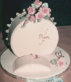This 8" round cake was made by cutting off a piece of the bottom of the cake about 1 1/2 inches. It was then covered in Pink Rolled Fondant on the front and sides as well as the back. The board was also covered in matching fondant. The butterful was cut out with a gumpaste cutter. The Lace pieces were made with a number 1 tube and royal icing. When they were dry they were placed on the number 3 bead boarder around the top back of the cake. The Gumpaste roses were all made without cutters and wired together, then placed on the top of the cake. One single Rose lays along side of the top portion of the cake that was cut. This portion that was cut also is covered in fondant.