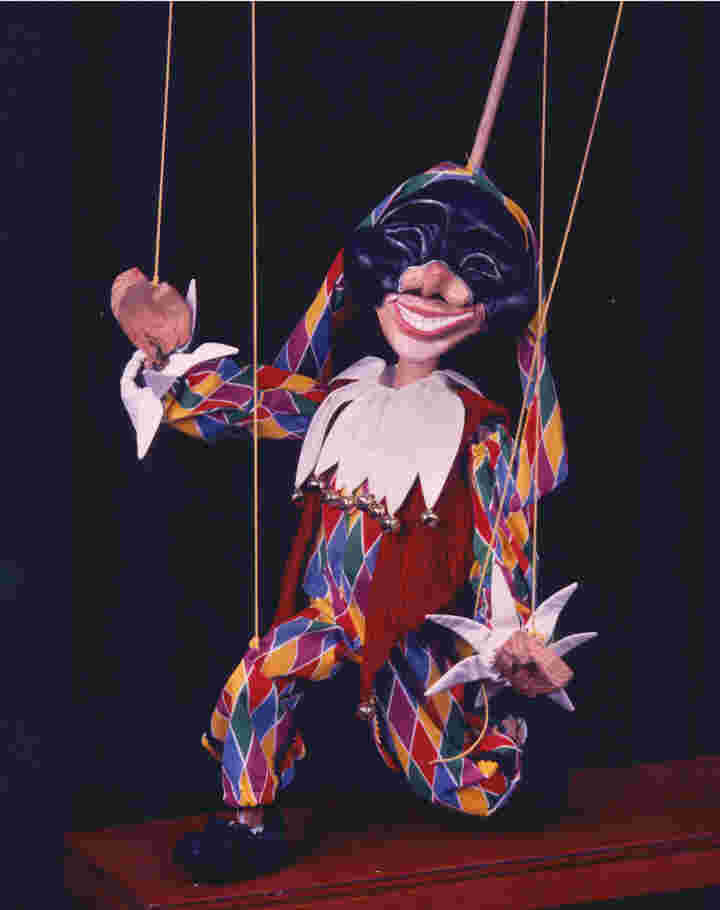 This is Arlequino from Other Hand Productions' Pinocchio. This puppet stands approximately 3 feet tall. His head is made out of papiermache and his body is slotted plywood (visualize a paperdoll.) He weighs about four pounds. To make the head smooth, I first sculpted it in clay (waterbased,) then I made a plaster cast of it, I pressed the papiermache into the mold and did 8 layers of sanding and gessoing. (gesso is a plaster-like primer used in painting) In our Pinocchio we use marionettes, found-objects, live actors and a style of theater called Czechoslovakian Black Would you like to see my design drawing?