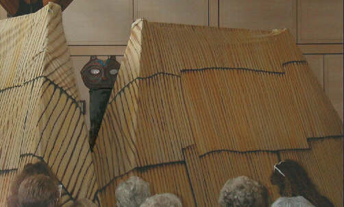 The puppetry style is overt rod, and the puppets are made to resemble Klickatat Indian baskets. Amy Gray, the puppeteer on the right designed the bodies and Lillian Pitt sculpted the masks. The large mask in the back is a representation of "She Who Watches" a petraglyph in the Columbia Gorge, that serves as a narrator in the story. Yes, she does separate from the column of stone.