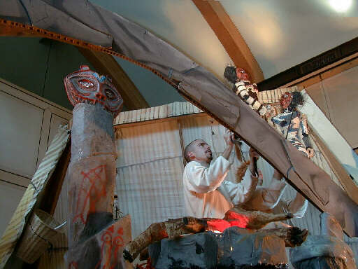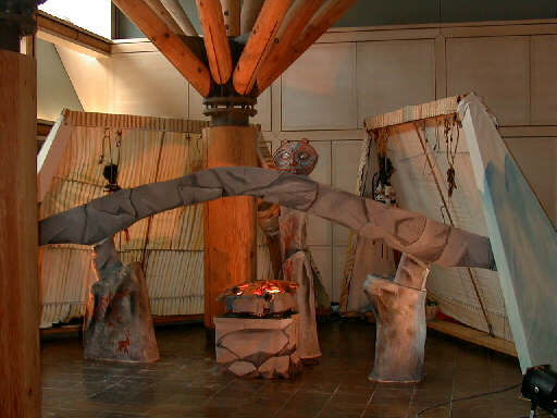 The tricky part was that then the long house had to open and the action would take place in the Columbia Gorge. Keep in mind that this is a touring show, and although it played to sold-out houses in the theater, it also had to play as well in a gymnasium. These photos were taken in a museum. The columns on the left and center of the photo are not part of the show.
